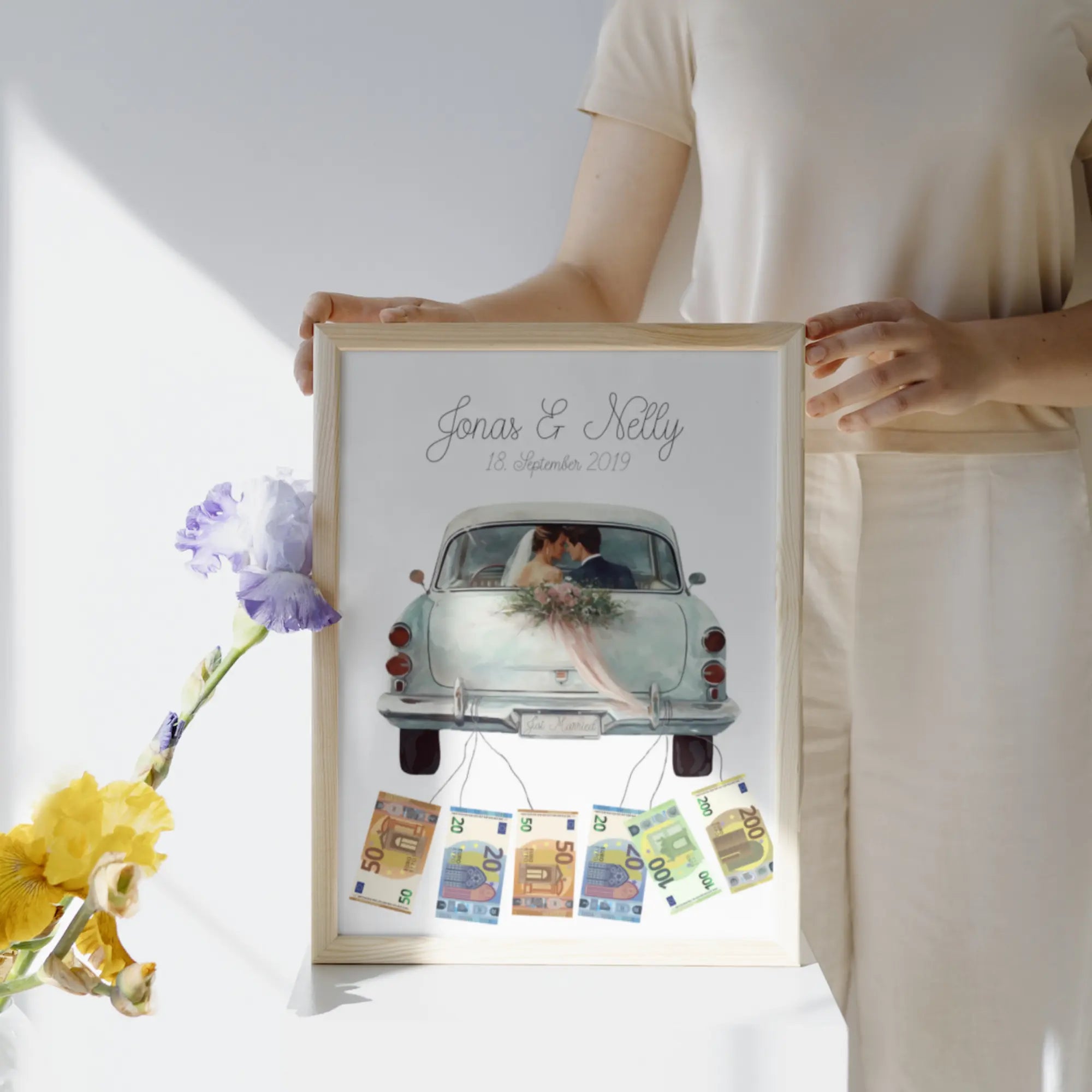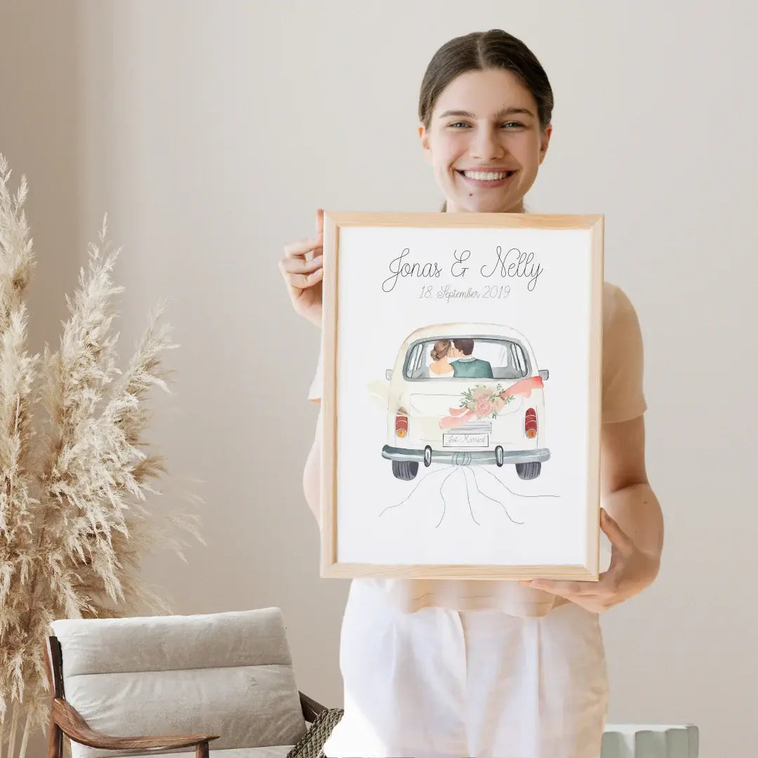Stell dir vor, du überreichst zur Hochzeit nicht einfach nur Geld in einem Umschlag. Stattdessen schenkst du etwas Personalisiertes, das Herzen berührt: Ein kunstvoll gestaltetes Hochzeitsposter, das das Brautpaar glücklich in ihrem Hochzeitsauto zeigt.
